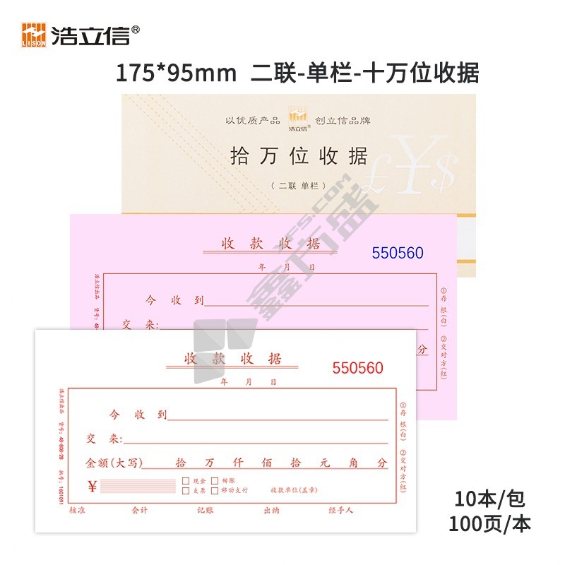 浩立信 拾万位单栏二联收款收据 100页 175*95mm 48-808-2B