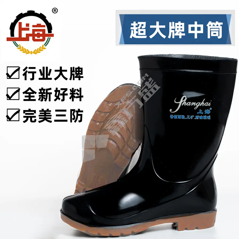 上海 704 中筒 男款PVC雨靴 42码 黑色